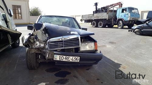 BUTA.TV xəbər verir ki, "Mersedes" markalı avtomobil yol ayırıcındakı daş maneəyə çırpılıb.